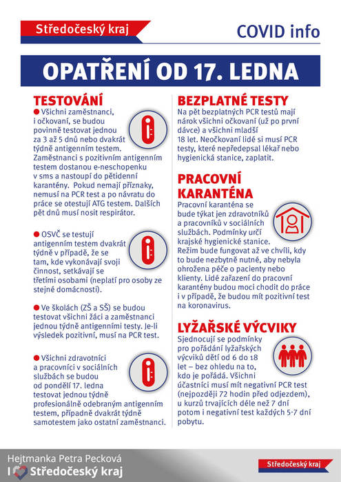 Od pondělí 17. ledna vstupují v platnost nová opatření, týkající se zejména testovaní zaměstnanců, podnikatelů a studentů, současně se sjednocují podmínek pro lyžařské zájezdy.