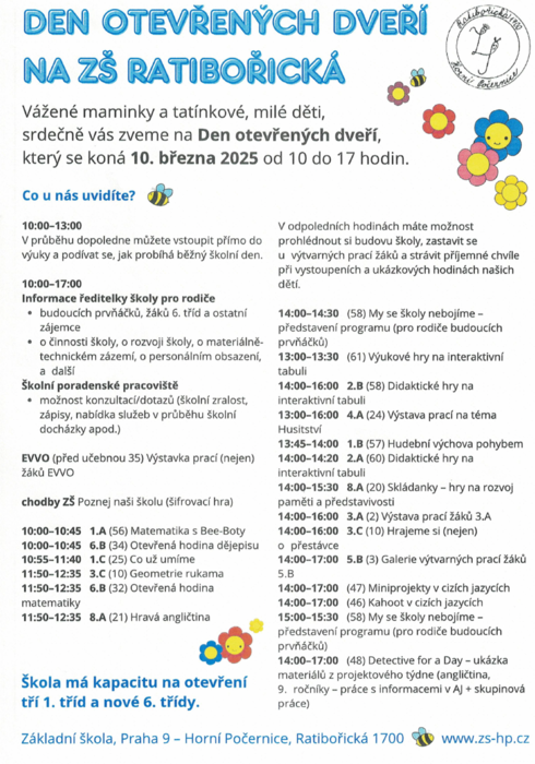 Vážené maminky a tatínkové, milé děti, srdečně vás zveme na Den otevřených dveří, který se koná 10. března 2025 od 10 do 17 hodin.
