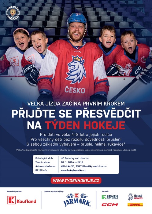 V sobotu 20. ledna od 9:15 se koná v HC Benátky nad Jizerou náborový den pro malé hokejisty či hokejistky. Přijímány jsou děti ve věku 4 až 8 let. Bližší info na www.hokejbenatky.cz