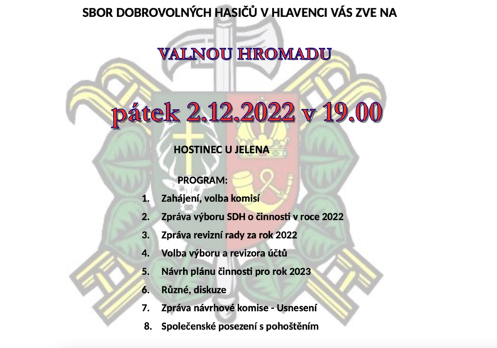 Sbor dobrovolných hasičů v Hlavenci všechny zve na Valnou hromadu, která se uskuteční v pátek 2.prosince od 19 hodin v hospodě U Jelena. Program naleznete v příloze.