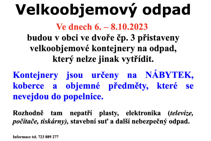 Ve dnech 6. – 8.10.2023 budou v obci ve dvoře čp. 3 přistaveny velkoobjemové kontejnery na odpad, který nelze jinak vytřídit. Kontejnery jsou určeny na NÁBYTEK, koberce a objemné předměty, které se nevejdou do popelnice.