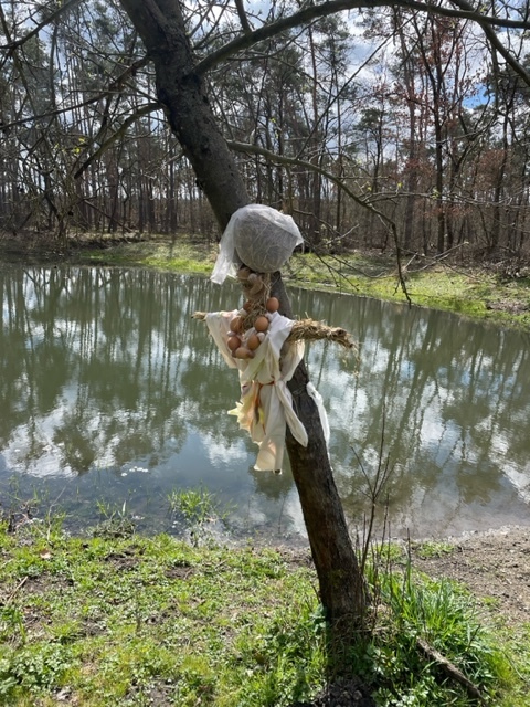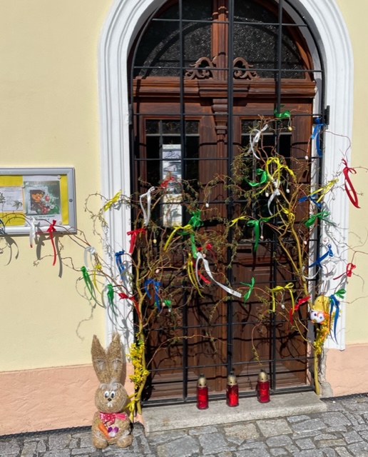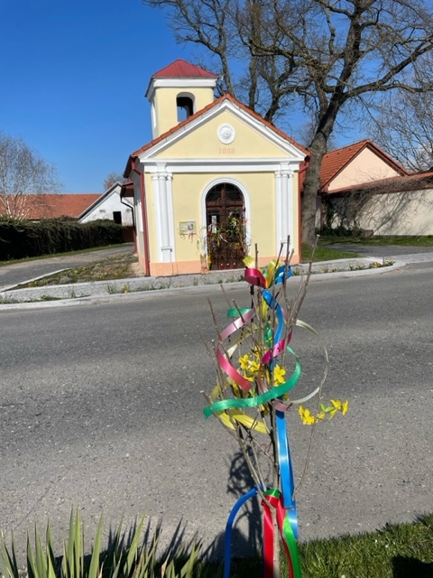 Hasičky velikonočně vyzdobily obecní kapličku a její okolí. Děti z Dětské skupiny Hlaveneček tradičně připravily postavu Morany pro lesní tůň Hulán.
