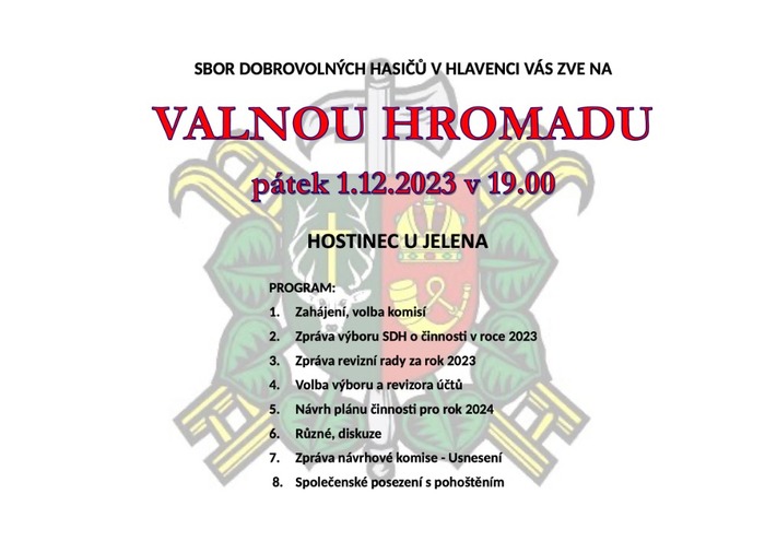 V pátek 1. prosince se koná Valná hromada v hostinci U Jelena, na kterou vás zve Sbor dobrovolných hasičů Hlavenec.