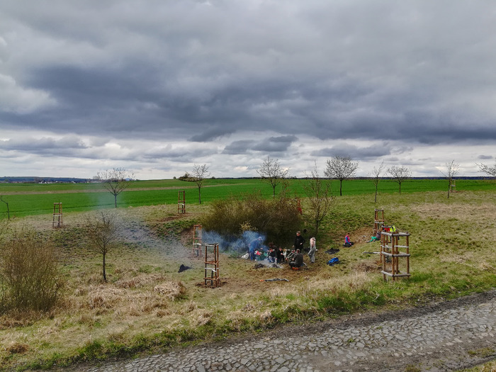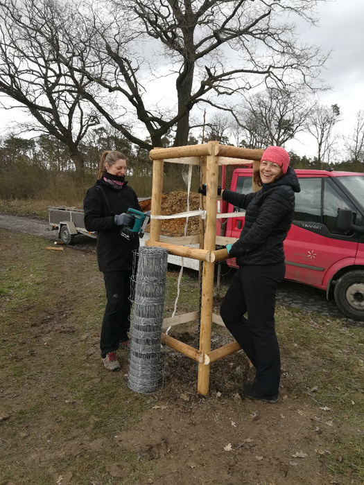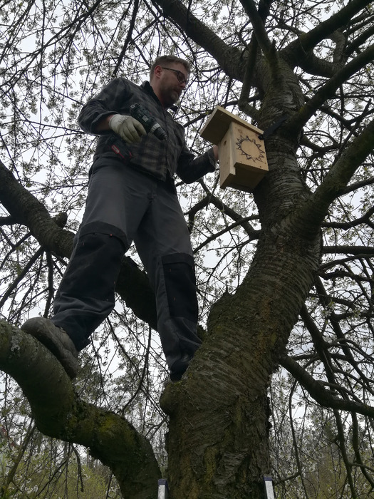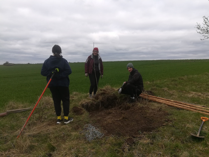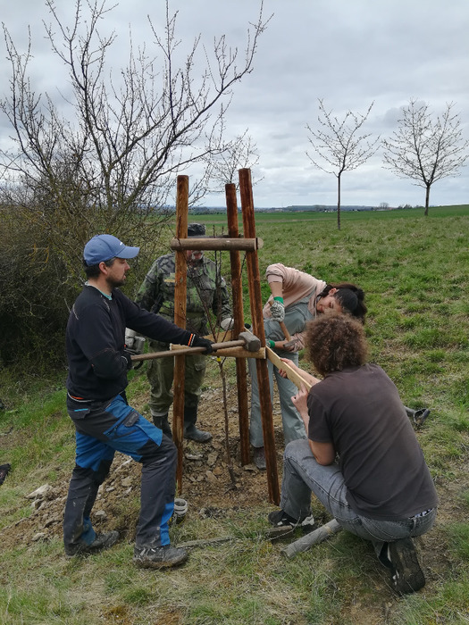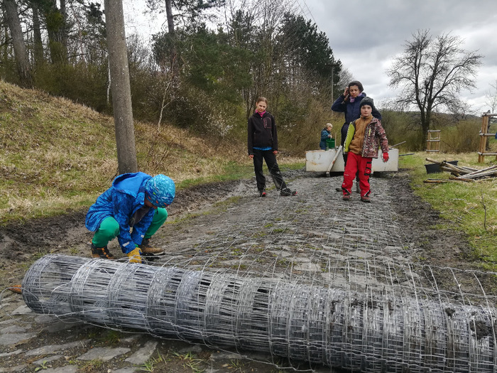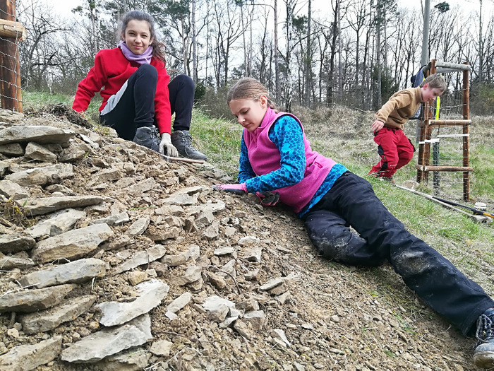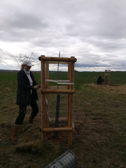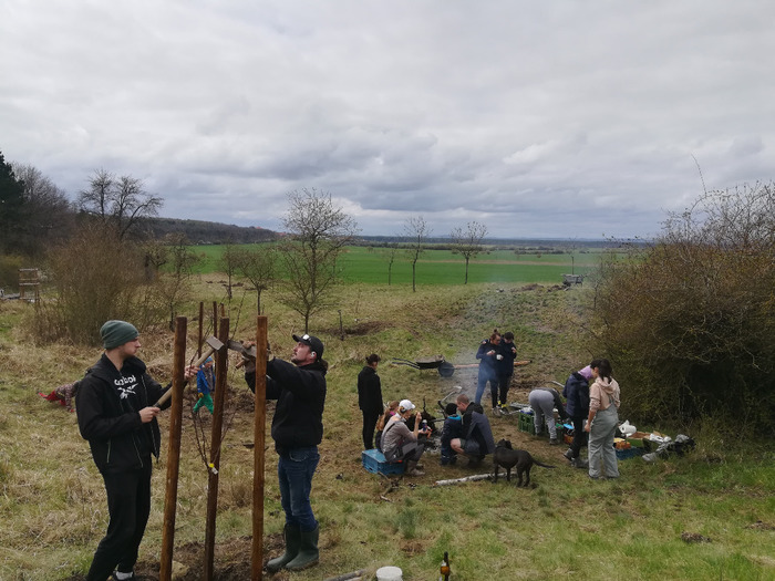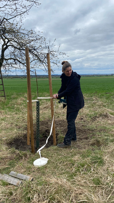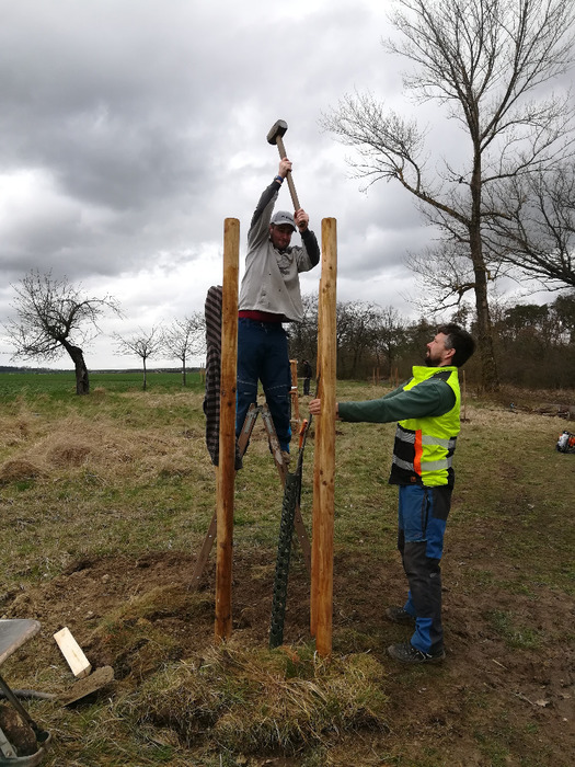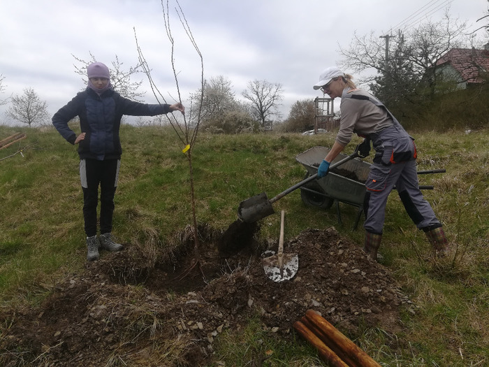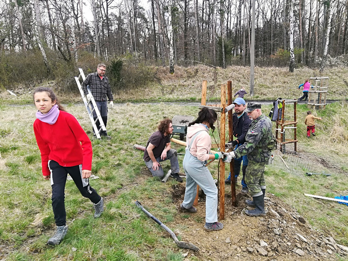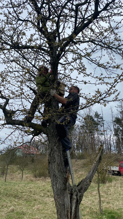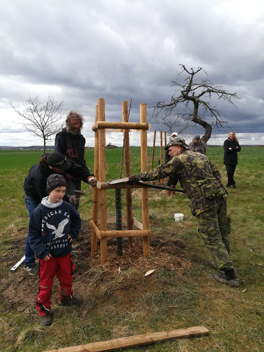 Dvě dubnové soboty (1. a 15.4.) jsme společnými silami dosadili stromy v sadu Na Skále (u hájenky), pověsili několik ptačích budek a vytvořili i malinké ještěrkoviště z opukových úlomků. Toto kouzelné místo s nádherným výhledem do kraje miluje také srnčí a dančí zvěř a bez ohledu na naši již několikrát vynaloženou práci s dosadbou sadu pořádají v těchto místech tajemná noční setkání s rituály, jejichž obětmi se často stávaly nově vysázené stromky. Ale všechna legrace jednou končí a tahle krásná okatá stvoření si k ničení budou muset najít něco jiného. 32 ovocných stromků (ořešáky, třešně, meruňky, hrušně a jabloně) jsme tentokrát opatřili ohrádkami z velmi silných kůlů, které jsme až do výšky 150 cm obalili lesnickým pletivem. Jako vždy jsme stromky přihnojili, ke kořenům přidali trošku té lepší prsti (zvláště tam, kde byla jáma až příliš opuková) a kolem kmínku vytvořili dostatečně velké zálivkové mísy, které jsme pokryli vrstvou štěpky.