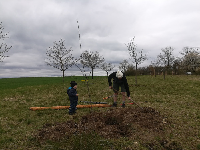Zvláště druhou sobotu jsme před akcí propadali trudomyslnosti, zda se sad podaří dosázet, jestli přijdou nějací dobrovolníci. Předcházející den celý propršel a ani předpověď na naše sázení nebyla příliš příznivá. Toho dne probíhající úklid obce (ukliďme si Česko-Hlavenec), svoz nebezpečného a velkoobjemového odpadu také nedával příliš naději na velkou účast. Naše skeptické úvahy se nenaplnily. Nejenže byl krásný bezvětrný a po dlouhé době nedeštivý den, ale přišlo i dost lidí. Dopoledne jsme sice začali sázet v menší partě, ale během dne, po úklidu, se postupně přidalo mnoho dalších nadšenců. Ve čtyři hodiny jsme měli hotovo. Možná se zdá, že 32 stromků je jako nic…to je pravda, vysadit stromek je téměř to nejlehčí… ale zhotovit každému bytelné kotvení a úvazky,